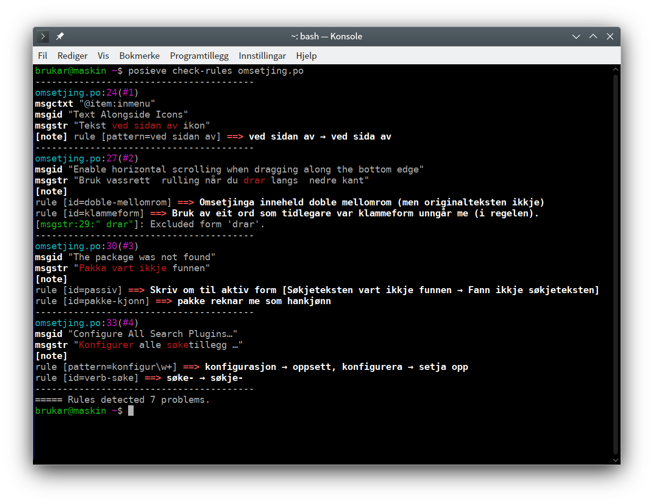 Me har eit system for automatisk/maskinell korrekturlesing av omsetjingane våre. Det kan blant anna brukast for å sjekka at omsetjingane følgjer dei språklege retningslinjene våre. Her er eit eksempel på korleis det fungerer: