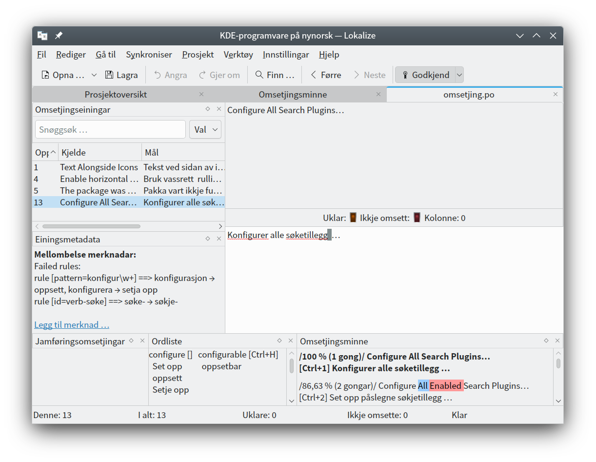Bokmålsomsetjarane har altså her ein jobb å gjera! Ein grei start kan vera å ta dei nynorske reglane og prøva å tilpassa dei til bokmål (der det høver). Ta kontakt på e-postlista vår l10n-no for teknisk assistanse.