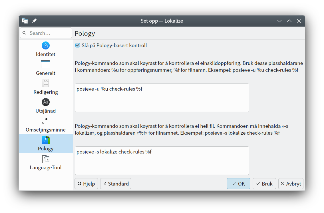 export PATH=$PATH:/home/brukarnamn/utvikling/pology/binNår du har starta terminalen på nytt, kan du no korrekturlesa ei omsetjingsfil eller ei heil mappe med omsetjingsfiler med kommandoar som